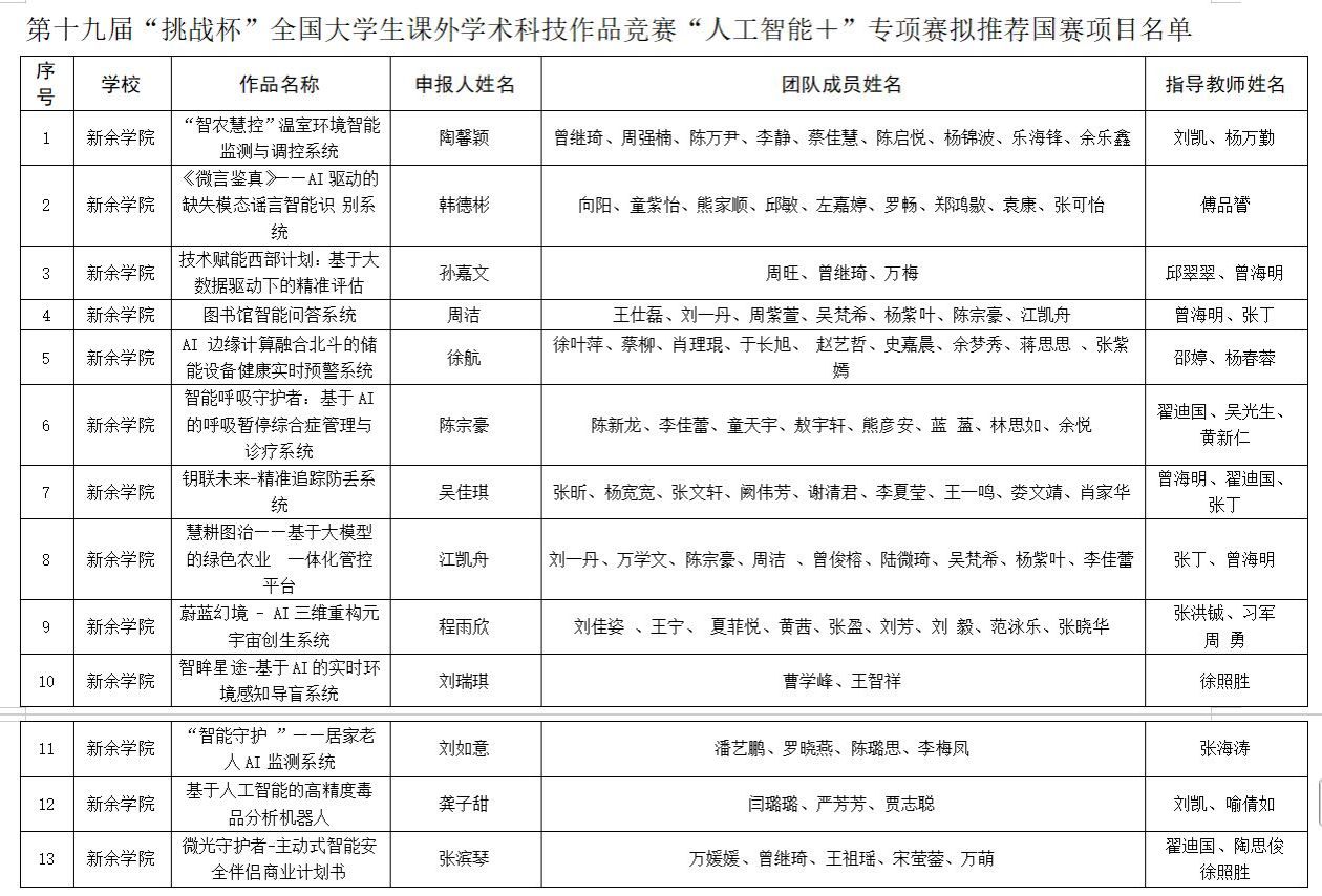根据《关于组织开展第十九届“挑战杯全国大学生课外学术科技作品竞塞的通知》要求,结合工作实际,经校、省两级推荐,现将拟推荐参加国赛项目公示如下。