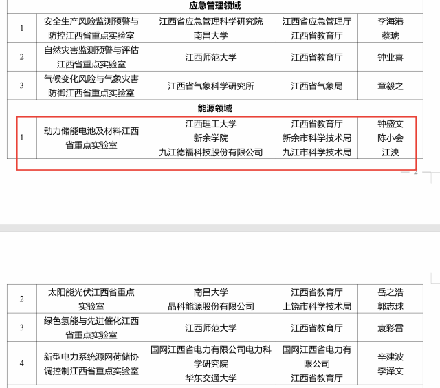 近日,江西省科学技术厅公布了《关于组建水利、应急管理、能源、交通等领域江西省重点实验室的通知》(赣科重发〔2024〕1号),taptap点点联合江西理工大学和九江德福科技股份有限公司申报的“动力储能电池及材料江西省重点实验室”获批组建。
