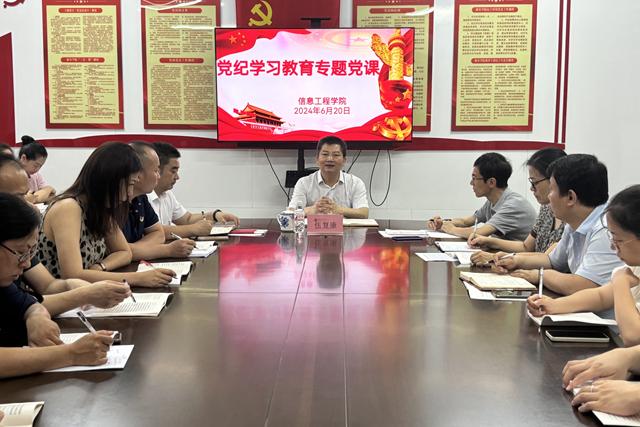 为深入学习贯彻习近平总书记关于党纪学习教育的重要讲话和重要指示精神,引导党员干部学纪、知纪、明纪、守纪,不断提高党员干部的思想自觉和行动自觉,推动全面从严治党向纵深发展,6月20日上午,校党委书记伍复康到所联系的信息工程学院讲授党纪学习教育专题党课。该学院党委书记晏志勇主持会议,学院全体教师党员及部分学生党员代表共计四十余人参加会议。