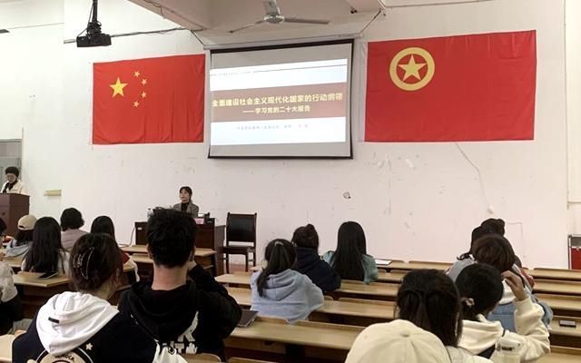 11月22日下午,该院用“请进来”的方式邀请市委党校教研二室副主任王佳,为全体教师及大三学生开展党的二十大精神宣讲。王佳从大会主题引入,围绕旗帜、思想、道路、精神、奋斗目标五方面对大会主题进行深入解读,见解独到深入、语言通俗易懂。她阐释了新时代十年成就推动我国迈上新征程、新时代新征程面临的机遇和挑战、开辟马克思主义中国化时代化新境界、以中国式现代化全面推进中华民族伟大复兴、以党的自我革命引领社会革命的重要内涵。