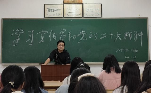 11月2日晚,文传学院2022级网络与新媒体1班在主B101教室举行专题学习会,集中学习党的二十大精神,班主任廖老师和全班同学参加学习。
