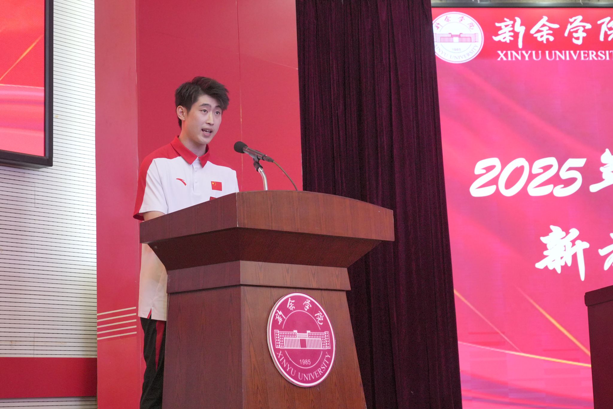 体育学院教师、中国男子健美操运动员、国际级运动健将张景山老师作代表发言。他结合从赛场回归校园,从运动员转变为教育工作者的经历和感受,分享了对教育使命的深刻理解,表示自己将坚守教育初心,以“匠心”打磨每一堂课,以“仁心”关爱每一位学生,以“赤心”践行育人使命。
