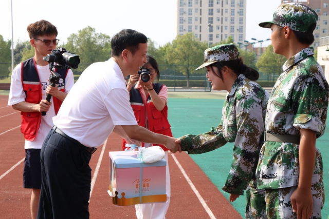 报告会结束时,校长张玉清、校党委副书记徐忠麟为当天过生日的18名参训新生送上了鲜花和生日蛋糕。“祝你生日快乐,祝你生日快乐……”一曲《生日快乐歌》在运动场上空回荡,与会师生共同唱响一首生日歌,给他们过了一个难以忘怀的生日。