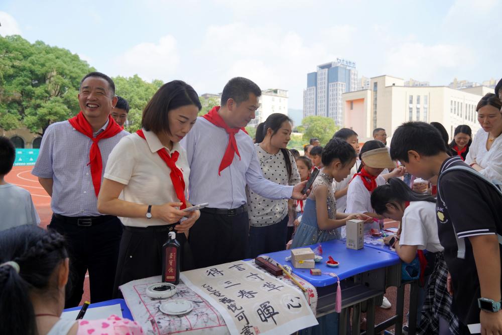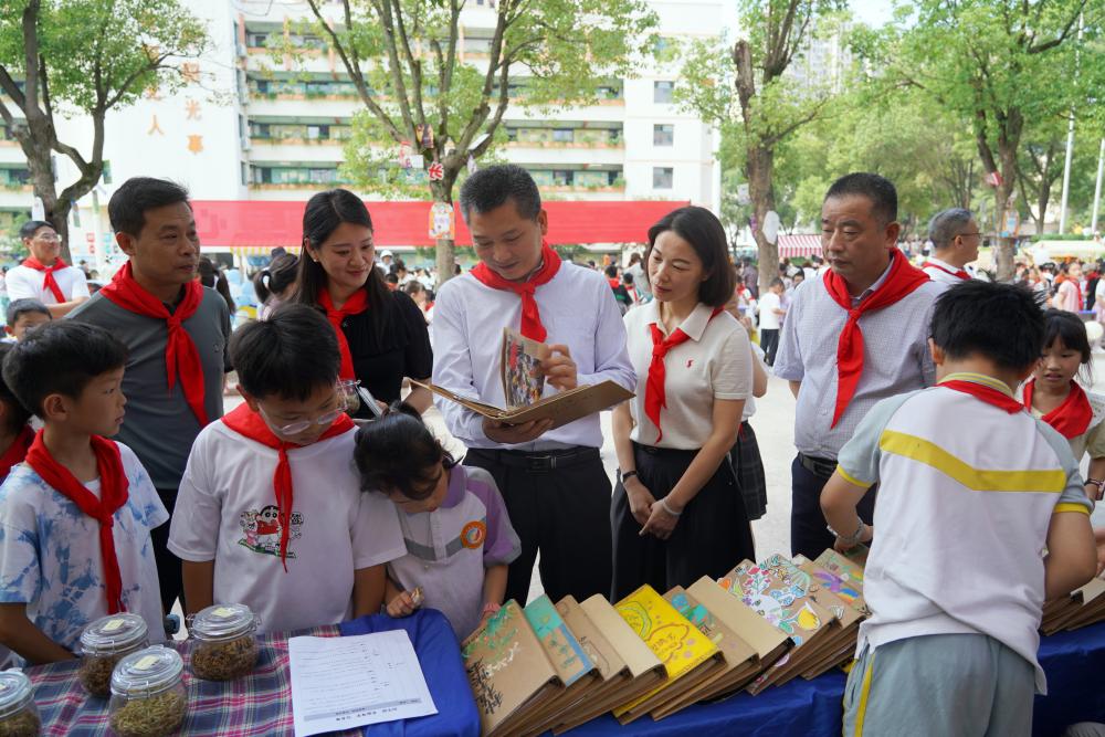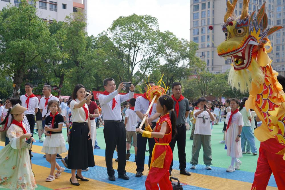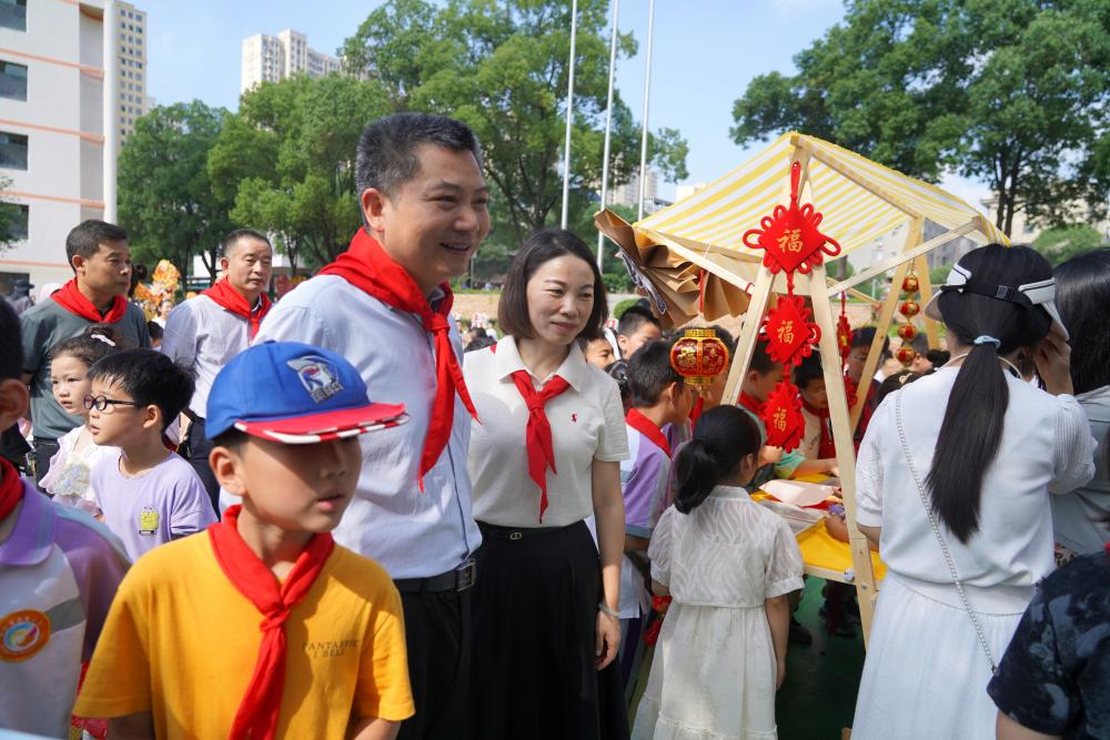 在传统游戏活动区,伍复康观看了孩子们喜爱的滚铁环、投壶、跳房子等趣味游戏,饶有兴致地欣赏了舞龙、舞狮、画漆扇、剪纸、绣夏布等活动,与孩子们亲切互动,勉励他们要秉持求知好学之心,在实践与创新中提升自我,争当爱党爱国、勤奋好学、全面发展的新时代好少年。他对附属学校在传承和弘扬非物质文化遗产中增强学生文化自信、促进学生多元发展的教育举措表示肯定。