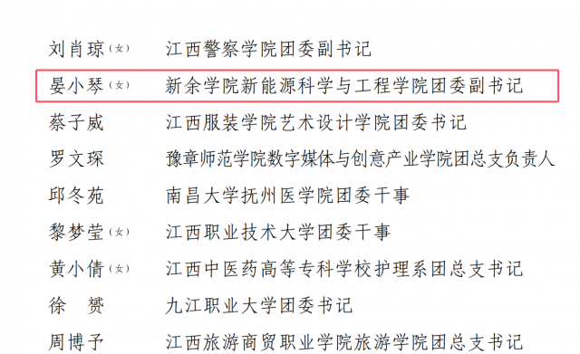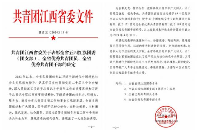近日,团省委印发《共青团江西省委关于表彰全省五四红旗团委(团支部)、全省优秀共青团员、全省优秀共青团干部的决定》(赣青发〔2024〕19号)中,taptap点点获多项荣誉。其中,校团委获“江西省五四红旗团委”荣誉称号,新能源与工程学院晏小琴获“江西省优秀共青团干部”荣誉称号,机电工程学院2021级机器人工程专业学生张新荣获“2024年江西省优秀共青团员”荣誉称号。
