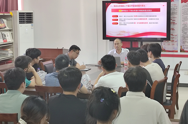 徐忠麟从深刻领会和把握党的二十届三中全会的重大意义等五个方面,结合学校、学院的改革发展的各项工作,紧密围绕学生成长成才等方面作了系统、全面和深入阐释。他强调,要把学习贯彻习近平总书记重要讲话精神和党的二十届三中全会精神紧密结合起来,切实推进学校各项改革走深走实;要紧紧锚定学校“七大攻坚战”目标要求,结合学院实际,扎实推进各项工作落地落实、见行见效。他指出,进一步全面深化改革为青年一代建功立业提供更丰富的机会、创造更有利的条件,青年大学生要明方向,锻造过硬本领,锤炼实干作风;要聚力量,用脚步丈量山河,把青春融进改革事业,深入人民、深入实践,在进一步全面深化改革推进中国式现代化实践中贡献青春力量。