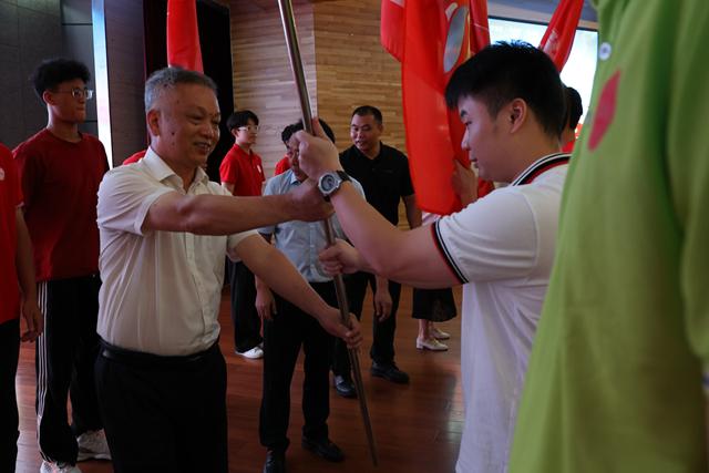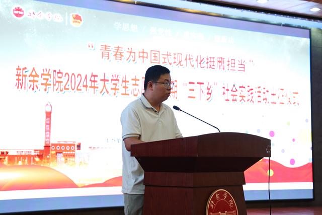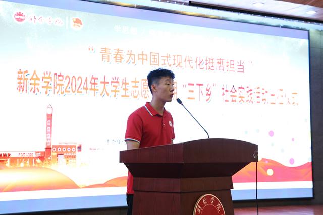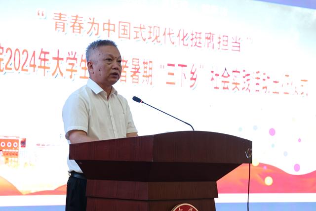 校领导、各二级学院相关负责人为2024年暑期“三下乡”社会实践团队授旗。各服务团队队长接过队旗,用力挥动着旗帜,表达广大学生志愿者坚定扎根基层一线、深耕乡村沃土、绘就青春梦想的步伐与决心。新能源科学与工程学院教师廖肇禄和机电工程学院周志明分别作为指导教师代表和学生代表发言。志愿者代表陈智晴同学带领全体志愿者集体宣誓。
