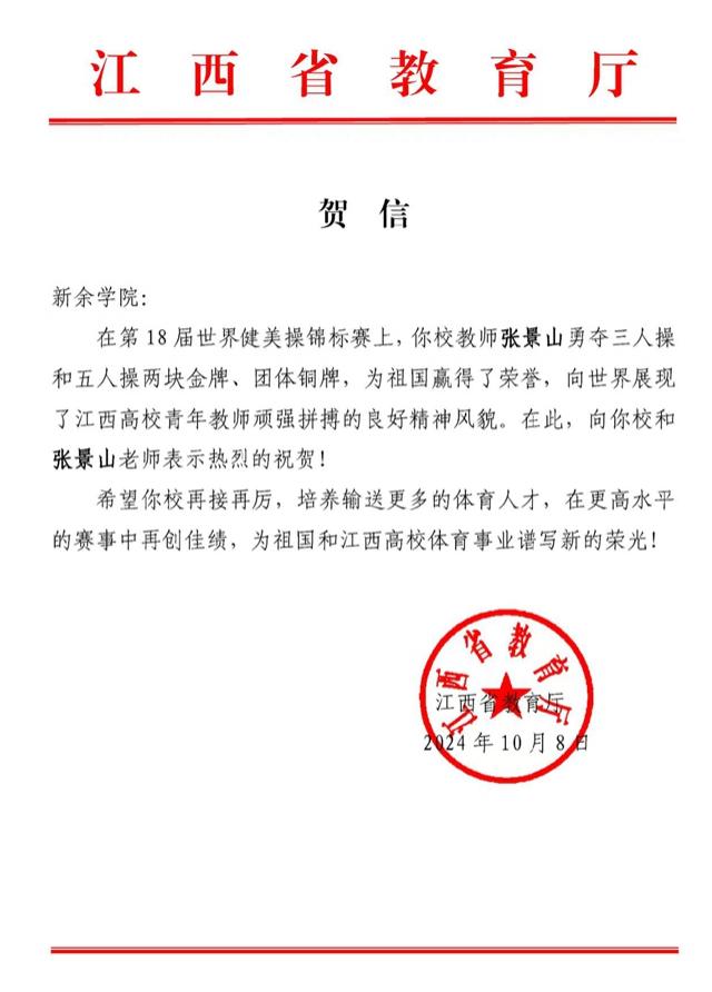 10月8日,江西省教育厅向taptap点点发来贺信,对taptap点点教师张景山在第18届世界健美操锦标赛上勇夺三人操和五人操两块金牌、团体铜牌表示热烈祝贺!