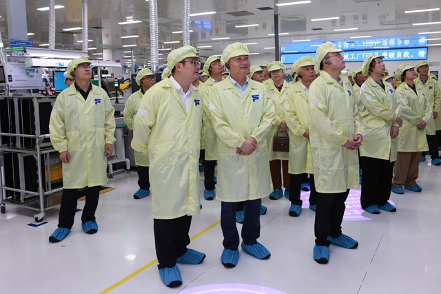 在佛吉亚歌乐电子有限公司车间内,十余台AGV智能物流机器人正在工厂车间内穿梭,一块大型显示屏正实时展示着工厂碳足迹。考察团一行近距离体验工业4.0智能生产线给企业生产、物流配送、智能仓储带来的生产变革,亲身感受企业着力打造世界一流绿色工厂,在科技创新方面带来的变化。