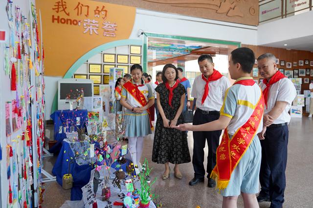 随后,伍复康来到“阅读书画艺术”学生作品展区,亲切与孩子们交谈,询问孩子们作品含义及创作过程。他指出:小学阶段是培养孩子阅读习惯和阅读能力的黄金时期,要让阅读成为一种生活习惯,希望孩子们养成阅读习惯,快乐阅读,健康成长;形成爱读书、读好书、善读书的浓厚氛围,同时对开展校园文化活动和社会主义核心价值观相结合表示肯定。