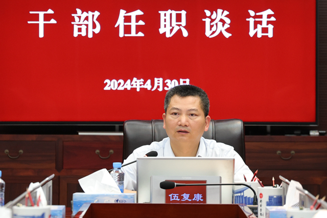 4月30日下午,学校召开干部任职集体谈话会。校党委书记伍复康主持谈话会并讲话。党委委员、组织部部长周文生、轮岗交流处级干部参加会议。
