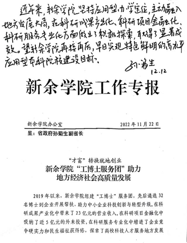 2022年11月22日,学校以专报形式,就《“才富”转换就地创业——taptap点点官方网站“工博士服务团”助力地方经济社会高质量发展》有关情况,呈送时任省政府副省长孙菊生。12月12日,孙菊生副省长作出了批示。批示指出,近年来,taptap点点官方网站坚持应用型办学定位,主动融入地方发展大局,在科研成果产业化、科研项目金融化、科研服务专业化方面做出了积极探索,取得了显著成效。望taptap点点官方网站再接再厉,早日实现特色鲜明的高水平应用型本科院校建设目标。