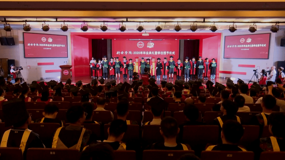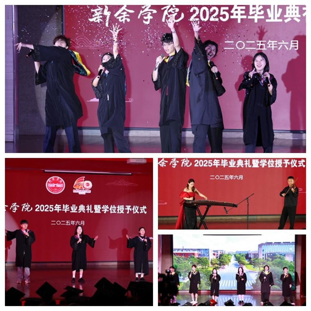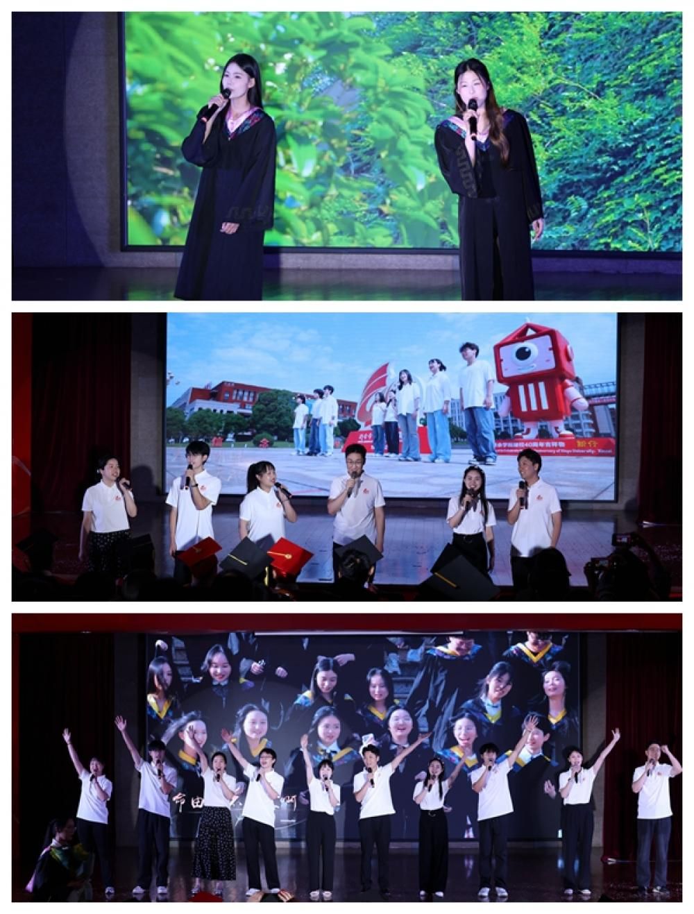 毕业典礼以一首充满勇气的《曾经的你》拉开序幕,人文学院的学生唱出了“走在勇往直前的路上”的无畏,回顾以往,有欢笑有泪水,但对未来依旧充满希望。机电工程学院的学生带来的《启程》充满了对未来的憧憬,鼓励毕业生们珍惜当下的同时勇敢追求自己的梦想。由音乐学院教师史俊、陈彦伊带来的小提琴古筝合奏《离别开出花》温柔而充满力量,仿佛在告别中孕育出新生,诠释了新院学子离别后依然心怀温暖勇敢前行的决心。一首《永不失联的爱》《一生有你》伤感却不显落寞,其淡淡的旋律充满了温度,展现了学校、老师和毕业生们的双向奔赴与牵挂。《老师我想你》,唱出了对老师的感激和依依惜别之情,也呈现出一幅幅师生共成长的温馨画面。当教师祝福视频开始播放时,一位位亲切的老师,一句句温暖有力的祝福,一个个熟悉的场景,宝贵的师生情谊,形影不离的同窗挚友……记忆闸门随之打开,深深触动着每一位毕业生。