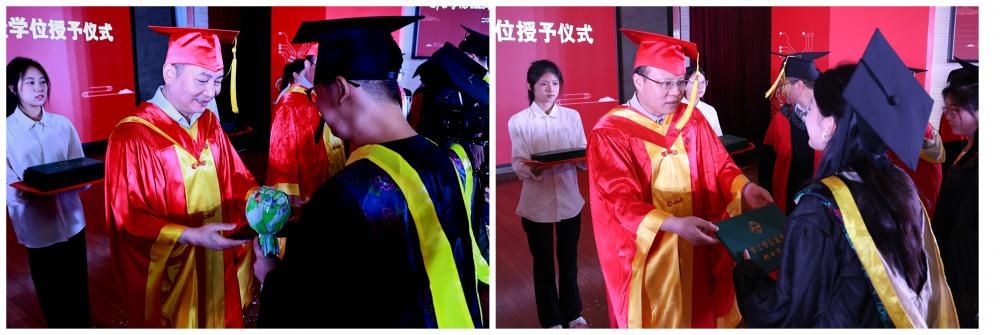 毕业典礼上,伍复康书记、徐忠麟校长、联系二级学院的党委班子成员、各二级学院领导、教师代表共同为毕业生授予学位,各二级学院党政负责人分别为优秀毕业生代表颁发荣誉证书和毕业证书,并赠送学校40周年校庆吉祥物,
