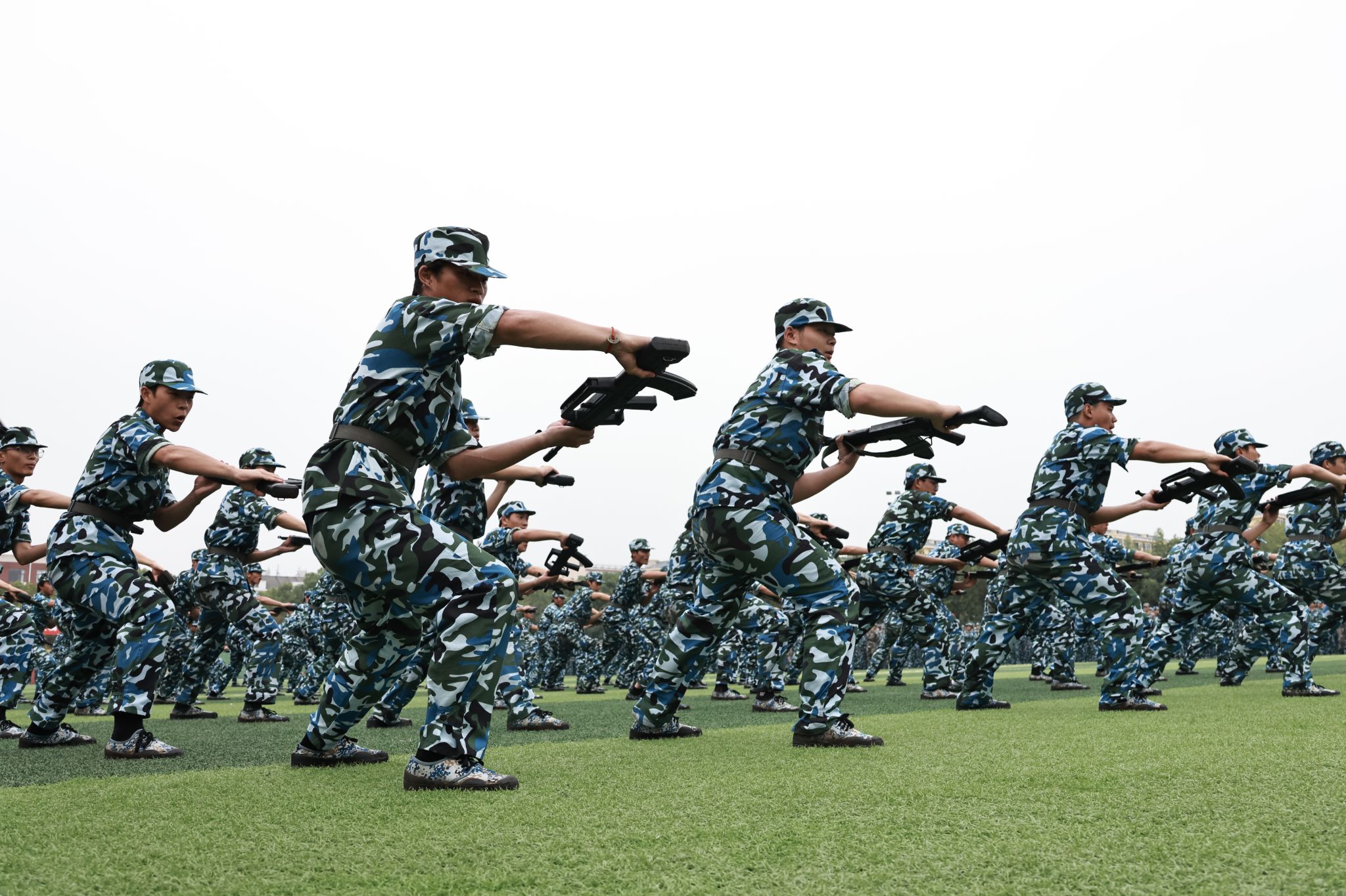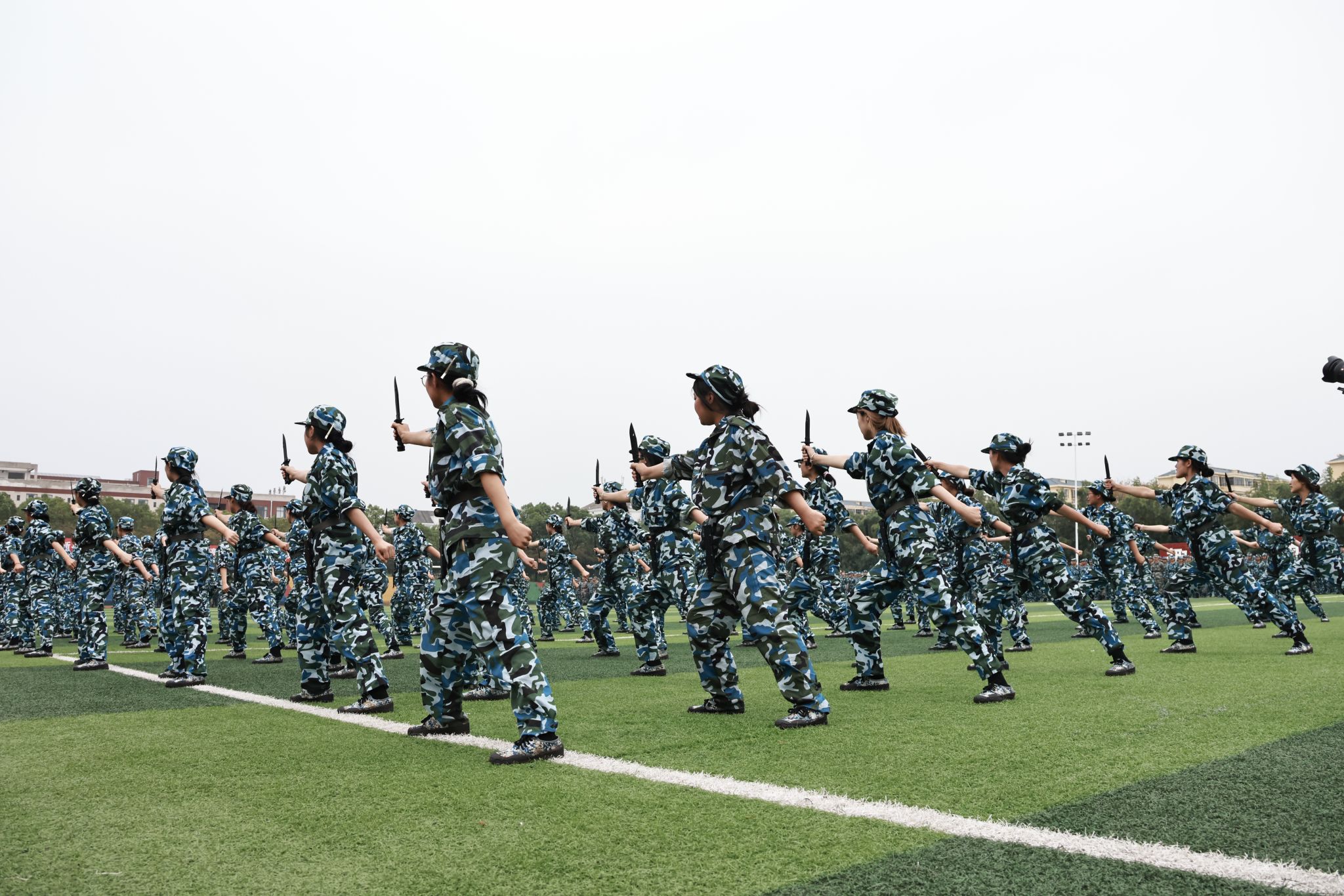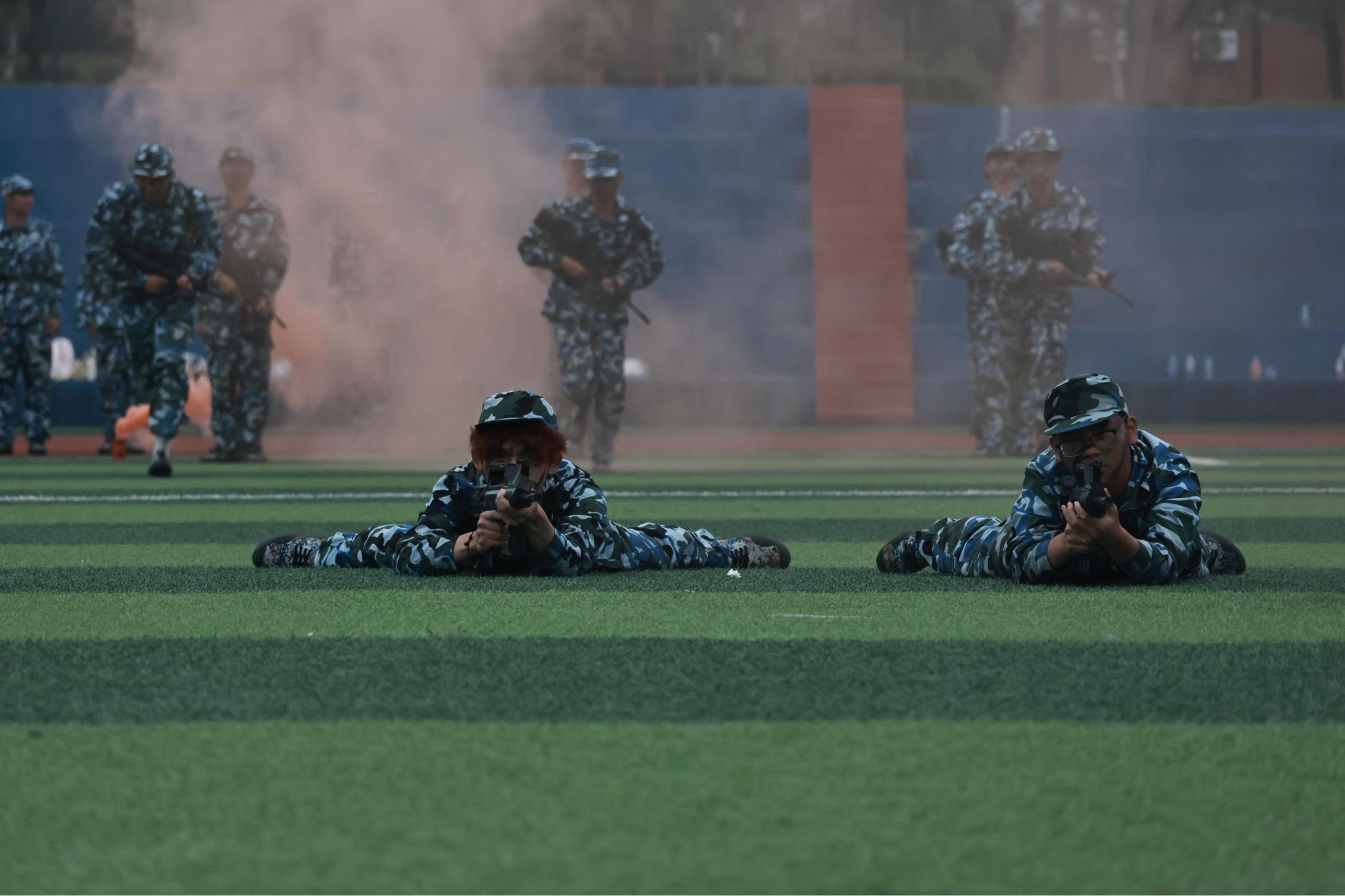 同学们身着统一迷彩服,步伐铿锵、口号嘹亮、气势昂扬,尽显新院学子朝气蓬勃、奋发向上的精神风貌。随后,军事科目汇报精彩纷呈。刺杀操表演率先登场,同学们手持模拟刺杀枪,动作干脆利落,尽显无畏斗志;捕俘刀方阵紧随其后,同学们手握训练刀,一招一式刚柔并济,劈、砍、刺、挑等动作连贯流畅,每一个招式都尽显攻防技巧的精妙;战术与救护科目中,同学们化身“战场尖兵”,迅速卧倒后以低姿匍匐穿越模拟“战场”,动作敏捷且隐蔽,救护操作过程紧张有序,展现出强劲的实战应对能力;最后登场的擒敌拳方阵,同学们出拳时拳风凌厉,踢腿时力道十足,“哈!哈!”的呐喊声震彻全场,将现场气氛推向高潮,看台上掌声雷动,喝彩不断。