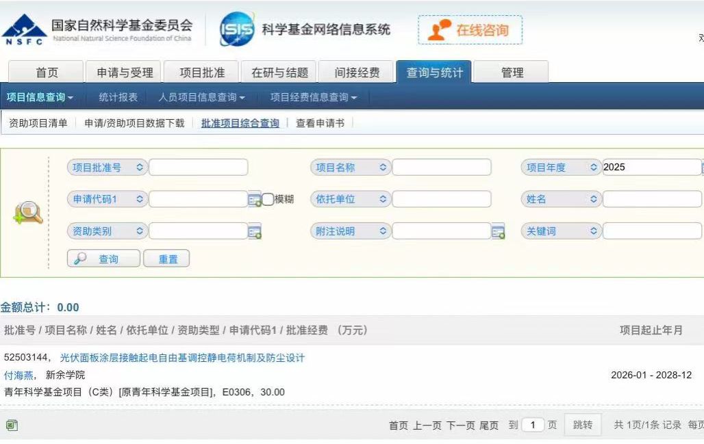 近日,国家自然科学基金委员会公布了2025年度国家自然科学基金集中受理期项目的评审结果,taptap点点新能源科学与工程学院付海燕博士申报的"光伏面板涂层接触起电自由基调控静电荷机制及防尘设计"项目成功获得立项,获批直接经费30万元。这是taptap点点首次斩获青年科学基金项目,标志着学校基础研究与科技创新能力实现重要突破。