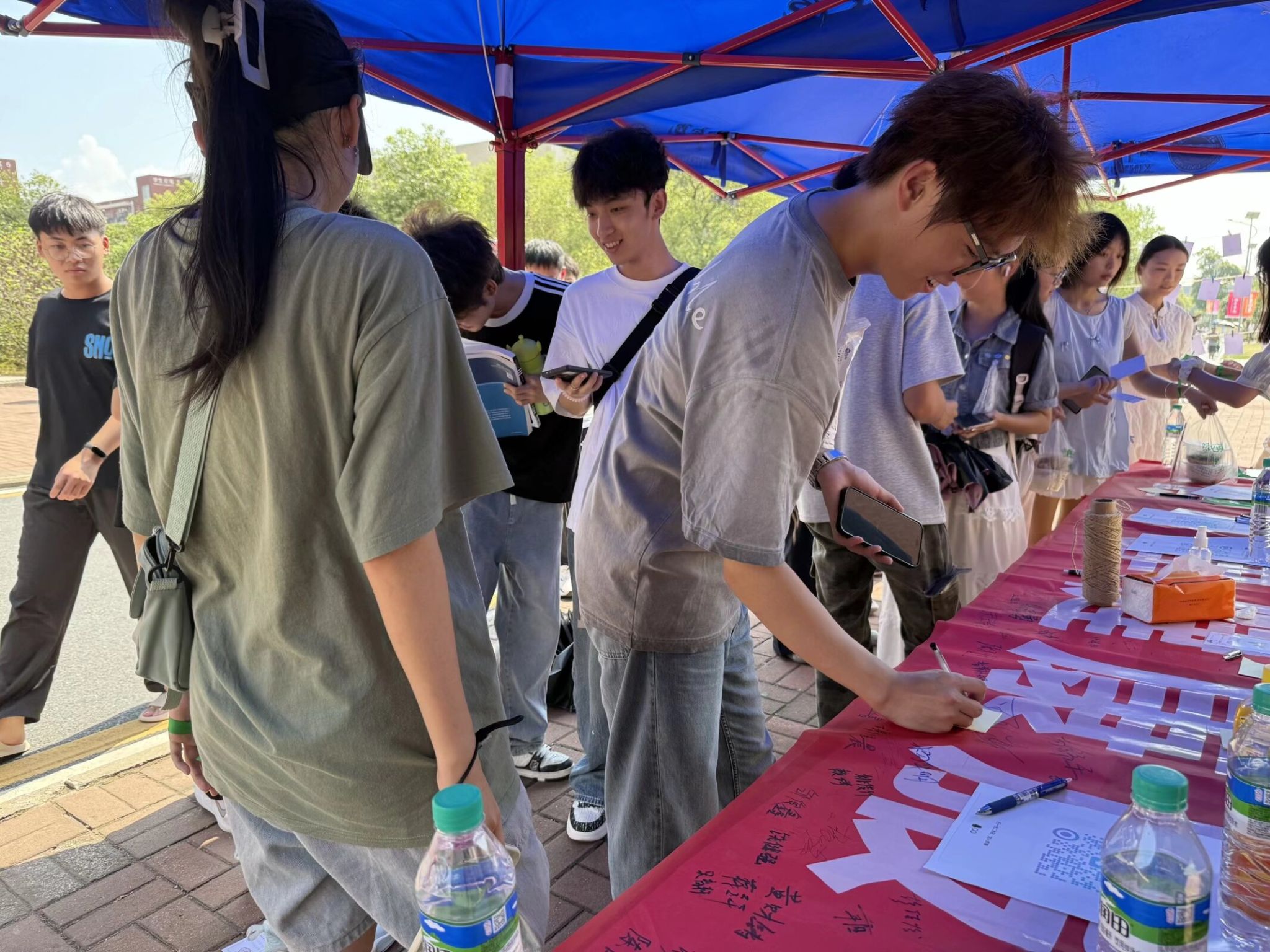 本次活动打破传统宣传模式,以“可视化+互动式”设计打造多重亮点,让心理关怀融入校园。活动前期,志愿者精心布置“100种爱自己的方式”主题图片展,并在校园内各处悬挂治愈系照片,以直观画面传递心理关怀,供师生驻足观赏、感悟思考。活动现场,“传递心灵传递爱”“爱己图鉴”“治愈之选”三大环节环环相扣,同学们在便利贴上写下致陌生人的暖心寄语,用文字传递正向能量,让善意与温暖在校园间流转;分享各自接纳自我、关爱自我的生活方式,在交流中深化“爱己”认知;撕下印有温柔话语的小字条,让治愈文字化解日常情绪烦恼。活动吸引了众多师生在“人人享有心理健康服务”横幅上签名,志愿者为同学们系上象征希望的绿丝带,并向同学们普及精神卫生知识,让关怀具象可感。