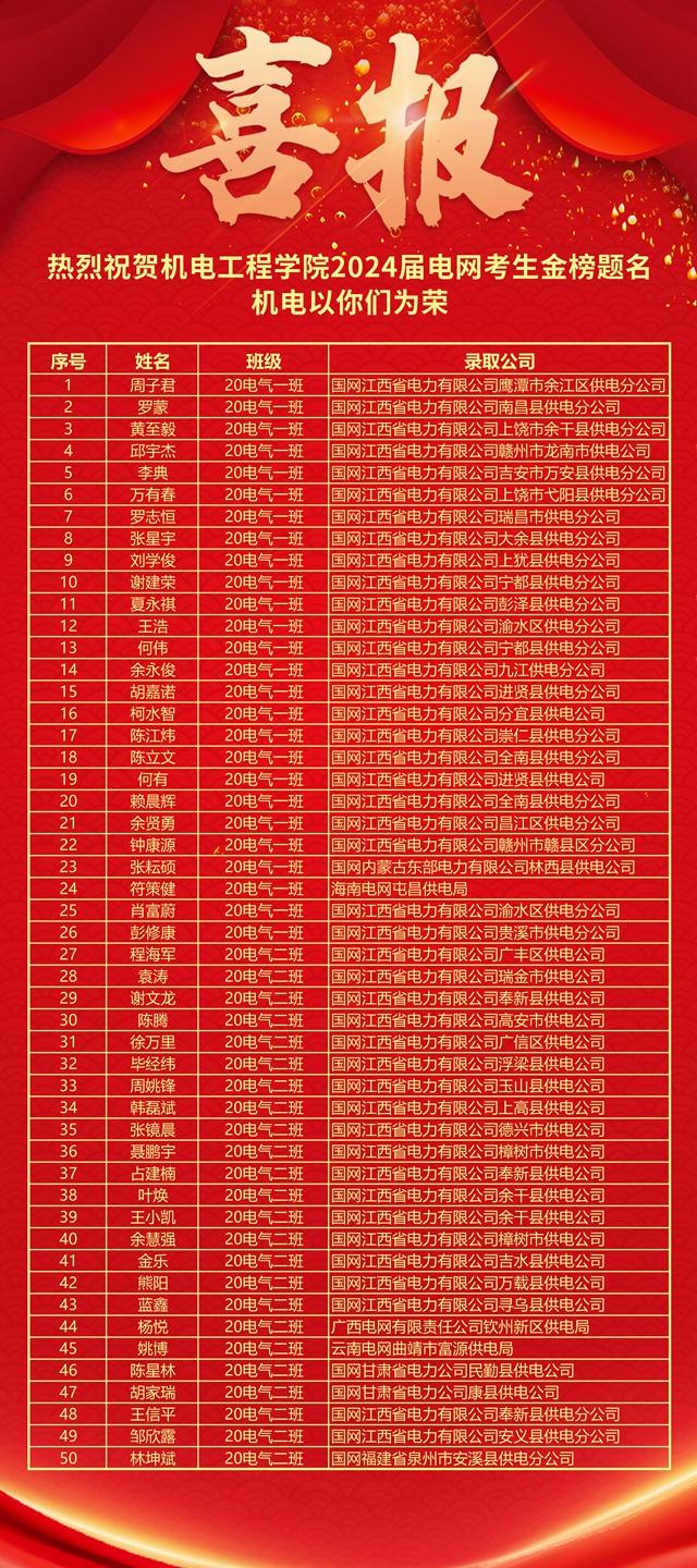 近日,2024年国家电网有限公司招聘考试结果已陆续发布,机电工程学院2024届电气工程及其自动化专业毕业生录取电网人数再创新高,录取率为52.06%,较上年增长13.08%,此外还有6人正积极备战南网面试。今年首次出现“...