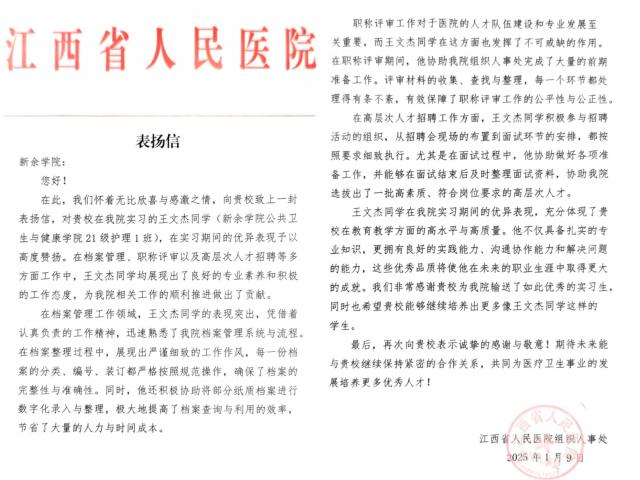 近日,江西省人民医院给taptap点点发来表扬信,对taptap点点公共卫生与健康学院21级护理学1班王文杰同学在实习期间的优异表现予以赞扬,对taptap点点在教育教学方面的高水平与高质量表示充分肯定。 表扬信中提到,王文杰同学不仅具备扎实的专业知识,...