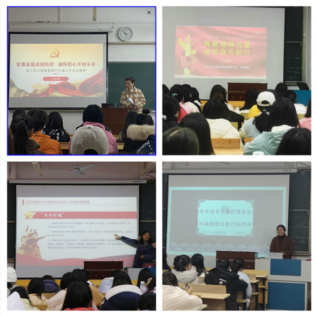 根据学校统一部署,连日来,文学与传媒学院领导班子刘君君、田建鑫、兰璐希、王颖怡到各专业各班级向学生宣讲党的十九届六中全会精神。12月27日,刘君君以《实事求是总结历史,满怀信心开创未来》为题,为播音专业学生宣讲党的十九届六中全会精神,...