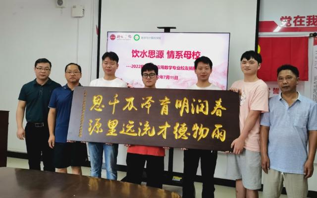 (图/文 数学与计算机学院 曾海明)“泽流及远,千里思源”,7月11日上午,数学与计算机学院校友暨2022届数学与应用数学专业毕业生涂志鹏、徐云球、周海、陈泽伟代表2018级数应1班、数应2班向该院赠送牌匾。该院党委副书记黄新仁和党委委员、...