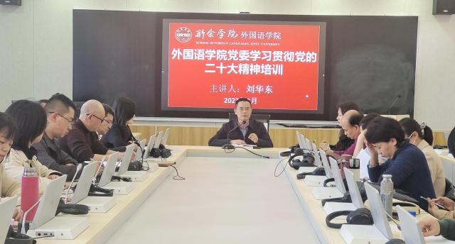 (文、图/外国语学院 黄仁静)3月14日,外国语学院党委书记、院长刘华东在文B云网络智能翻译实训室为学院全体教师讲授党的二十大精神专题培训课。刘华东从党的二十大报告新论断入手,重点传达学习党的二十大报告中有关教育和人才的部分,...