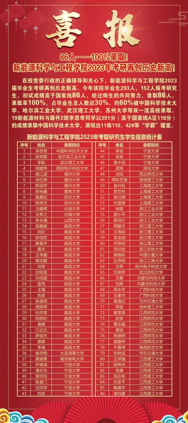 在校党委行政的正确领导和关心下,新能源科学与工程学院2023届毕业生考研再创历史新高。今年该院毕业生293人,152人报考研究生,初试成绩高于国家线86人,经过师生的共同努力,录取86人,录取率100%,占毕业生总人数近30%...